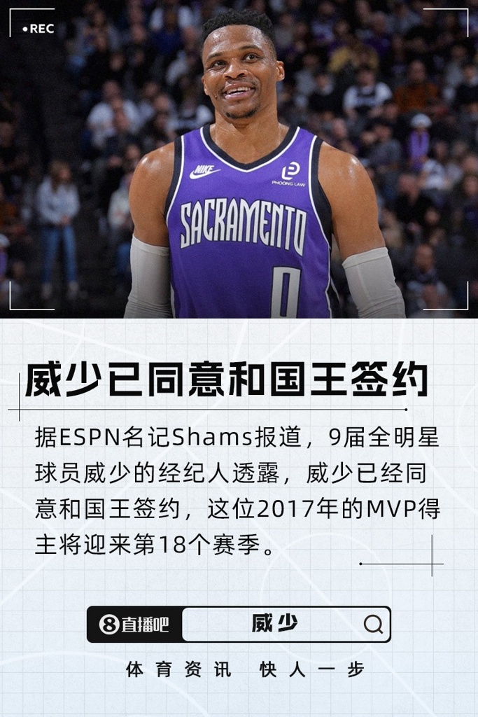 底薪️9届全明星威少同意签约国王 历史三双王终于敲定下家了