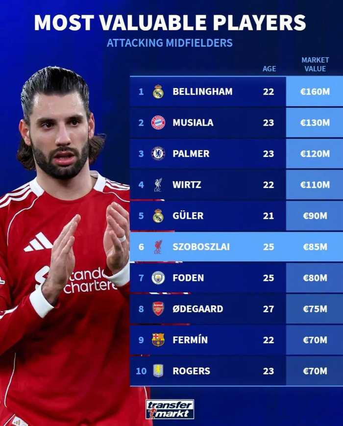 德转公布进攻型中场身价榜,贝林厄姆1.6亿欧居首