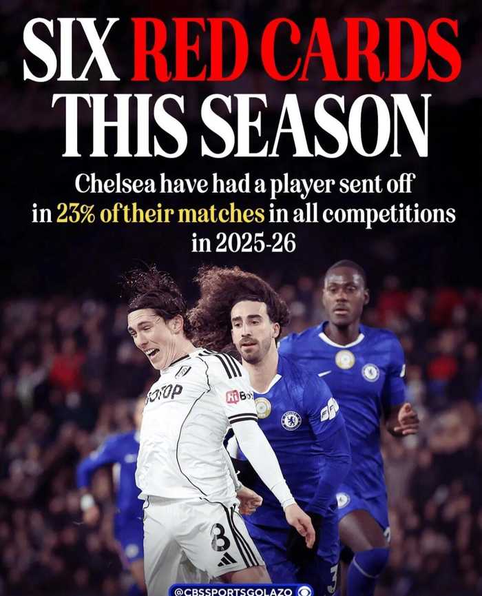 切尔西本赛季6人染红创纪录,23%比赛10人作战